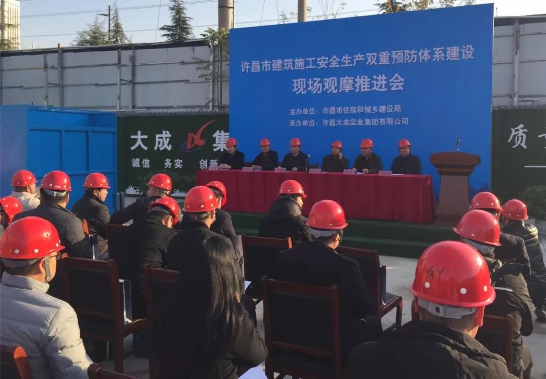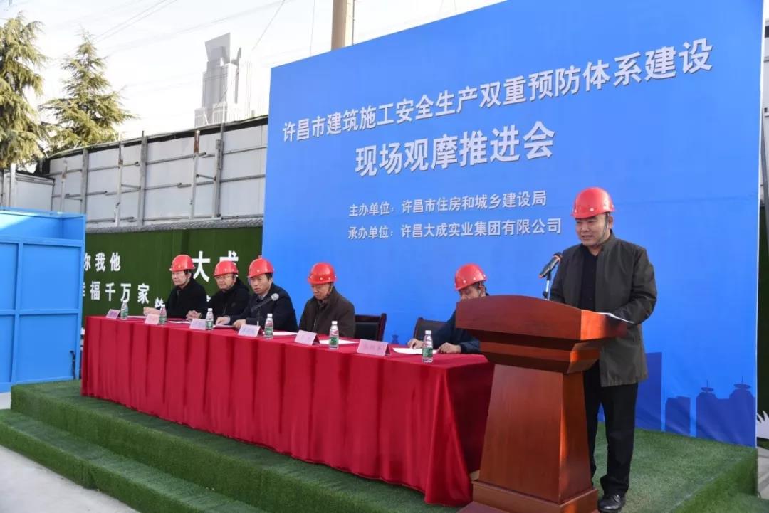 近日,由许昌市住房和城乡建设局主办、集团公司承办的许昌市建筑施工安全生产双重预防体系建设现场观摩推进会在公司一峰广场项目施工现场举行。市住建局副局长尹群安、建管科科长朱延昭、安监站副站长彭保华,各县区市住建局分管安全副局长、安监站站长,集团公司领导高峰、李耀,一峰集团地产公司总经理郭红军,全市二级以上施工企业代表近百人参加会议。会议由朱延昭科长主持。