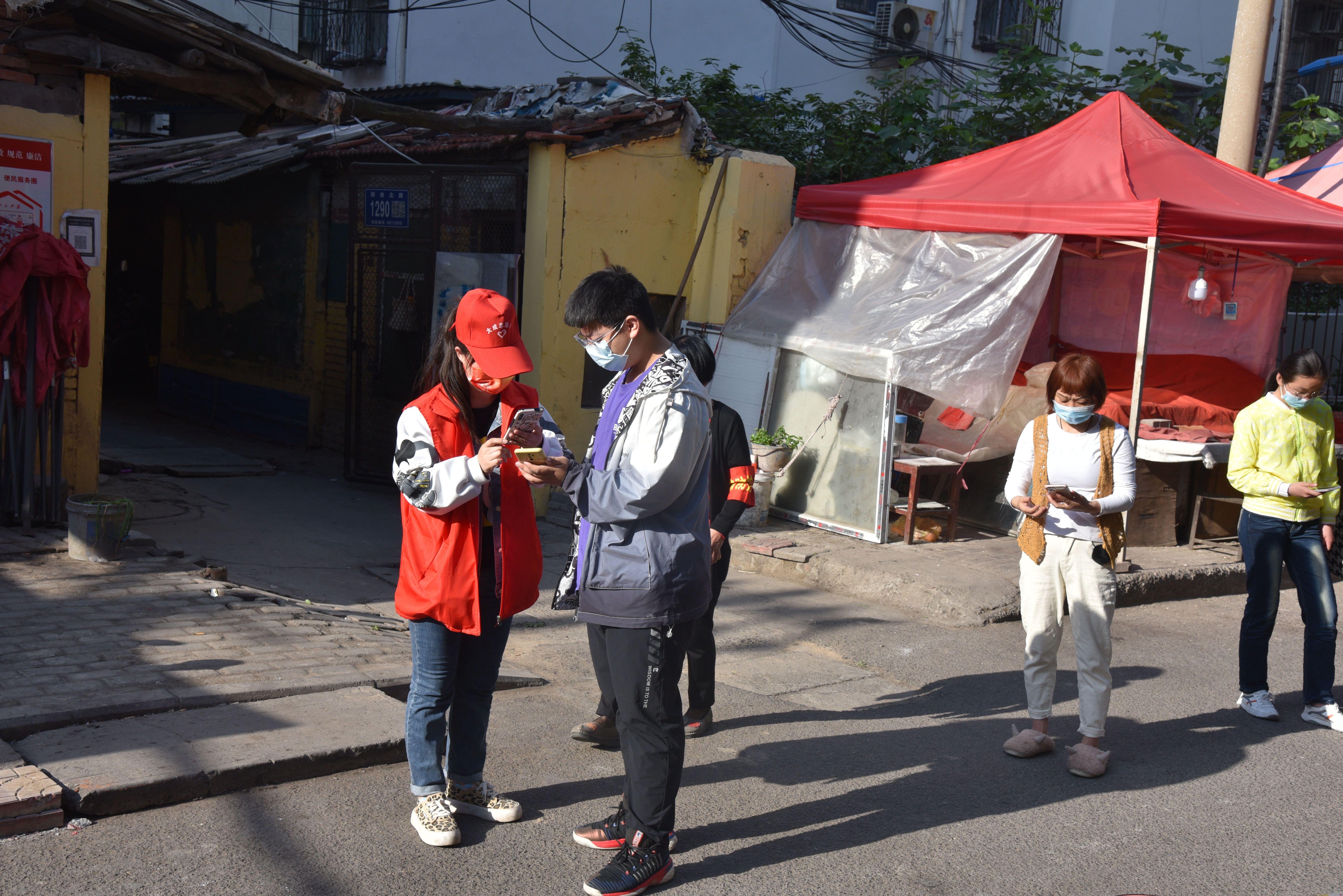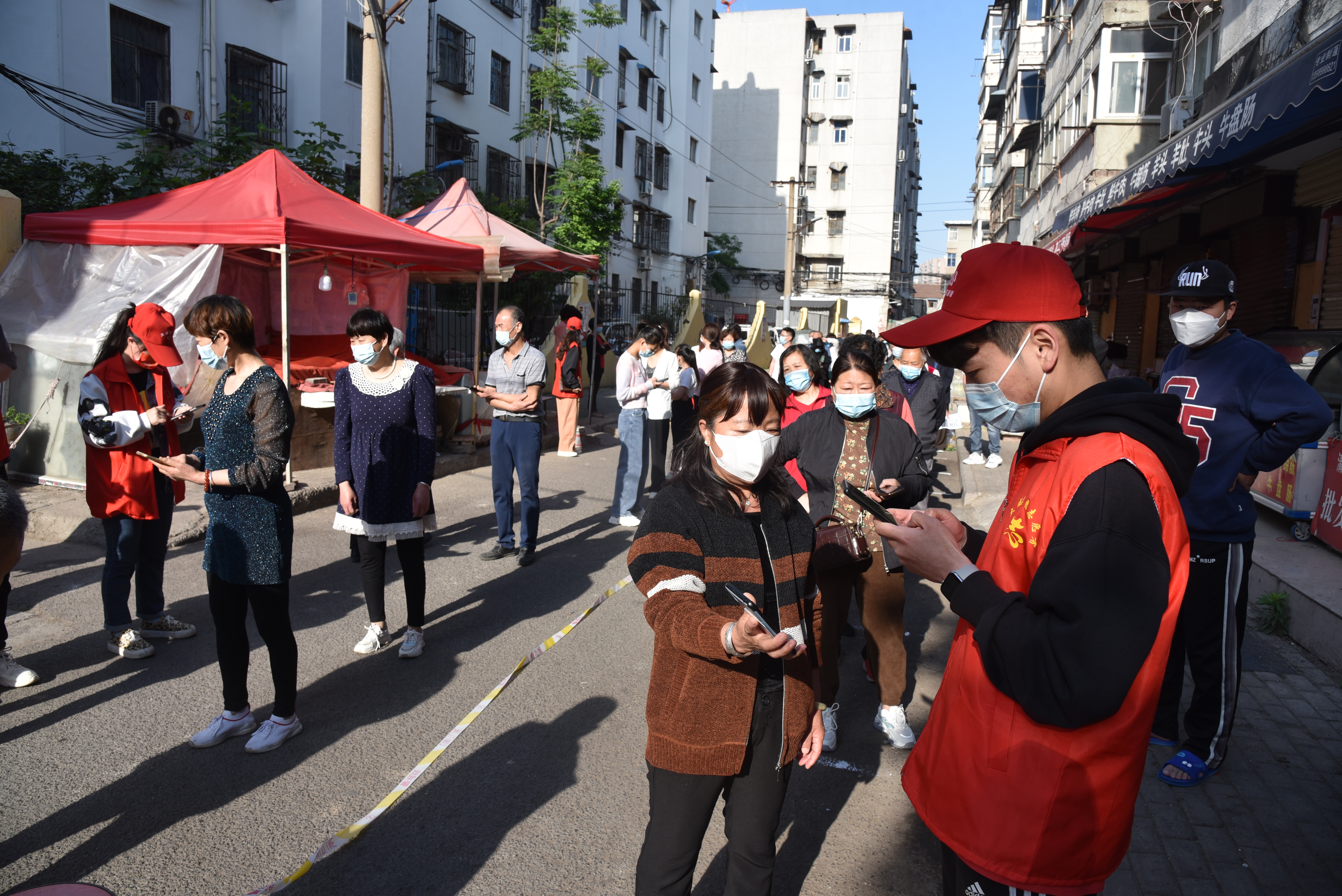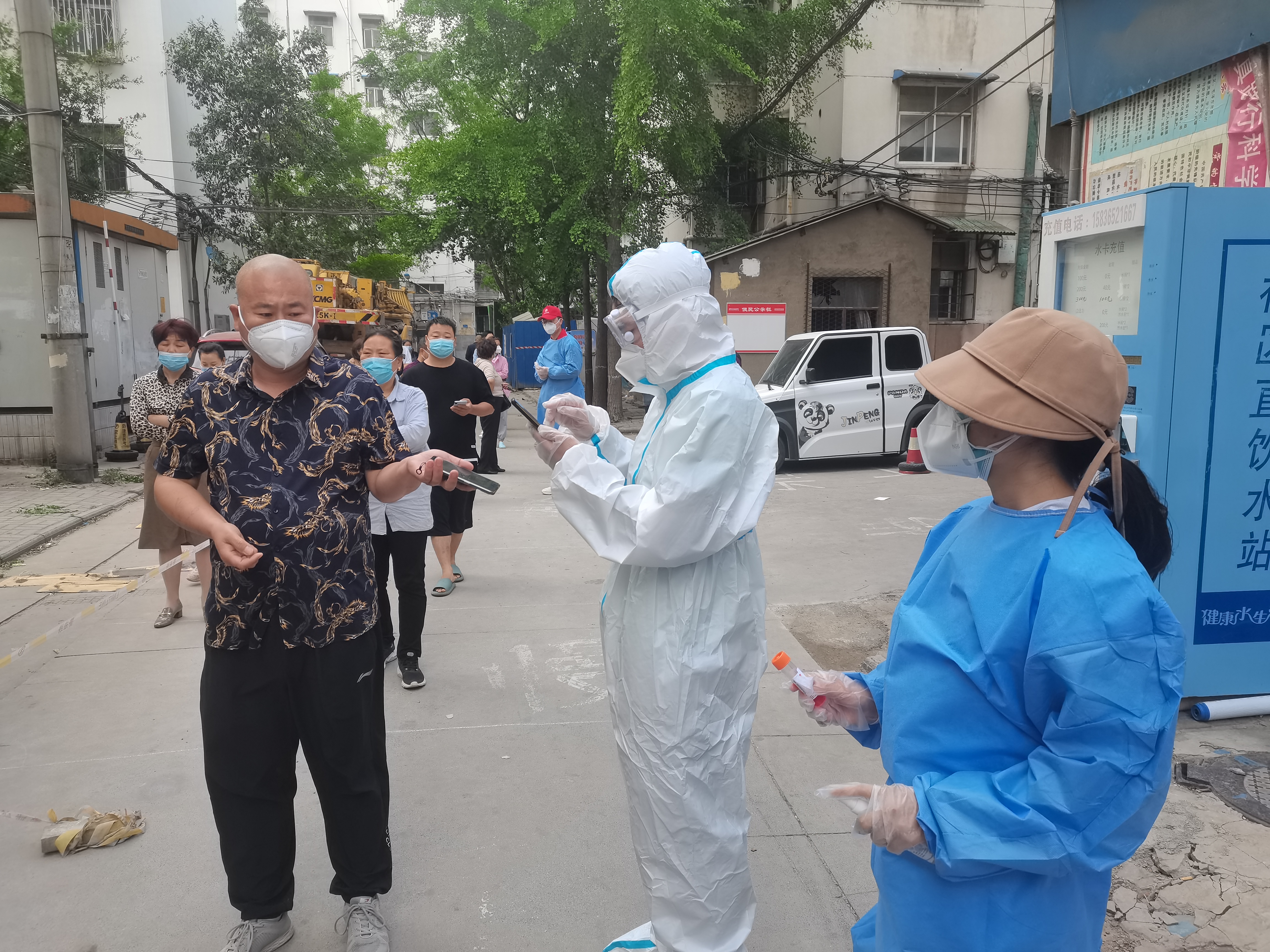 5月7日,由于重点人员较多,物业分公司员工李晋生与录码人员宁炳旭、张豪楠、赵明月等在铁路家属院一直坚持到下午2点多采集完核酸才吃上饭。