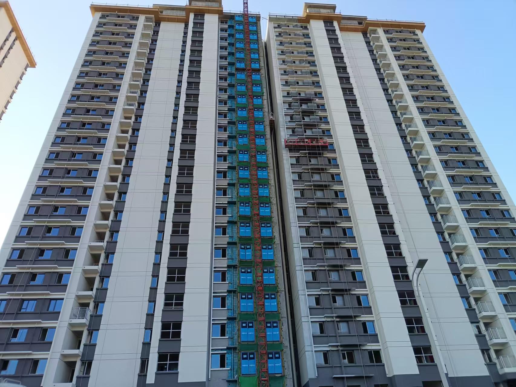 走进施工现场,映入眼帘的是整齐搭建的脚手架和忙碌的施工人员。他们身着统一的工作服,头戴安全帽,在各自的岗位上紧张而有序地工作着。有的工人在精确地测量墙面尺寸,为后续的施工提供准确的数据;有的则熟练地操作着各种施工设备,站在吊篮里进行着墙面的打磨、粉刷等工作,集团公司承建的1#、2#楼外墙粉刷工作已完成85%。